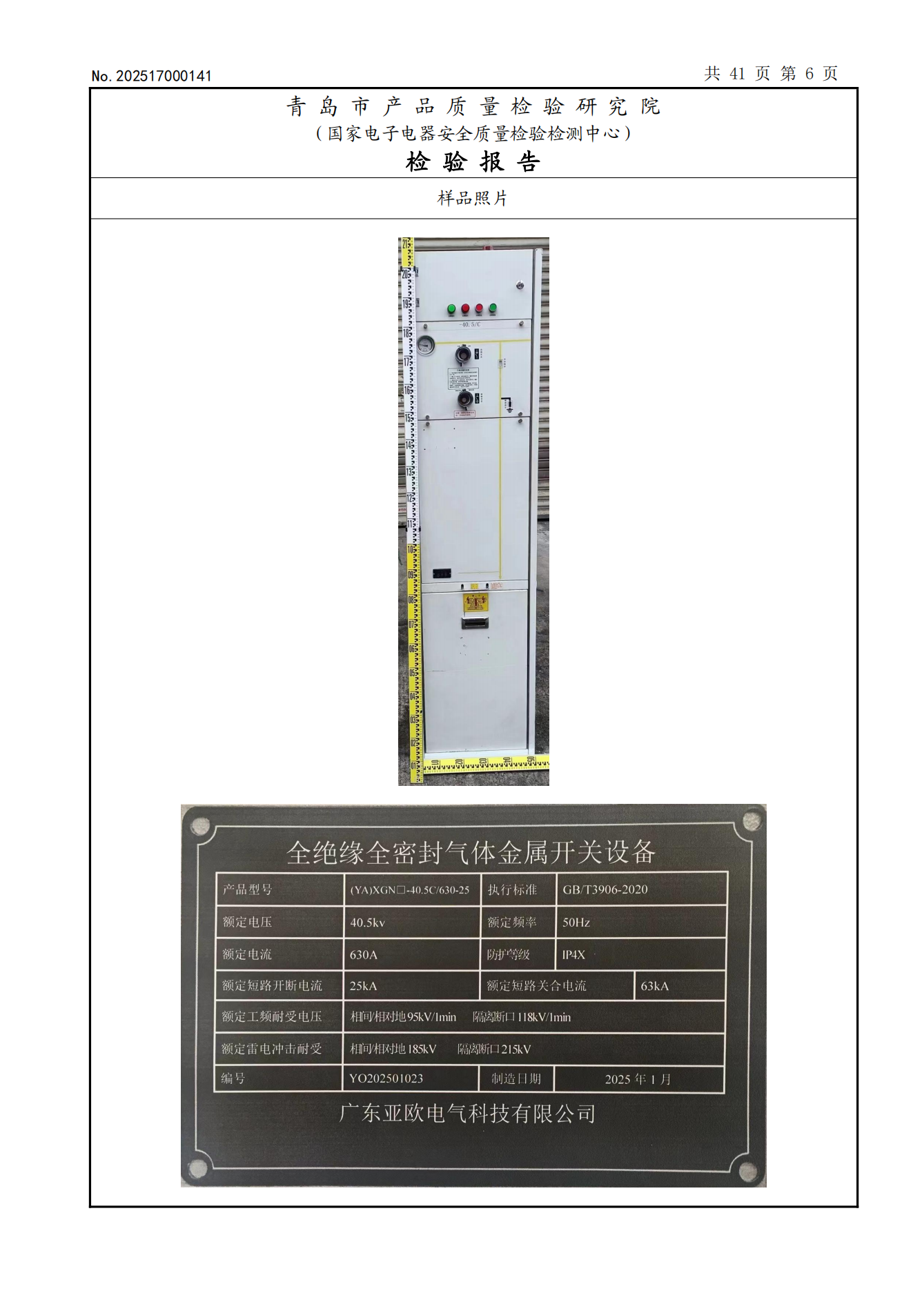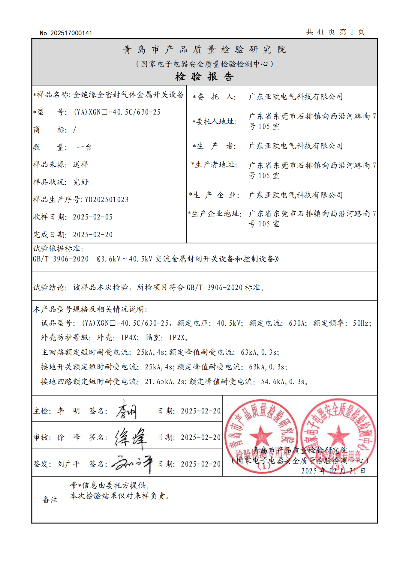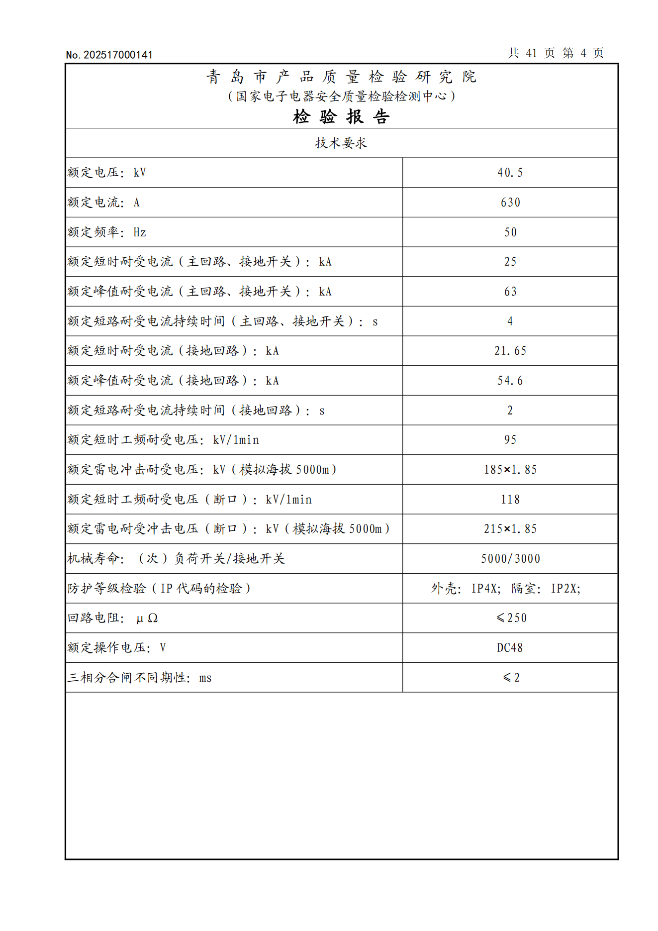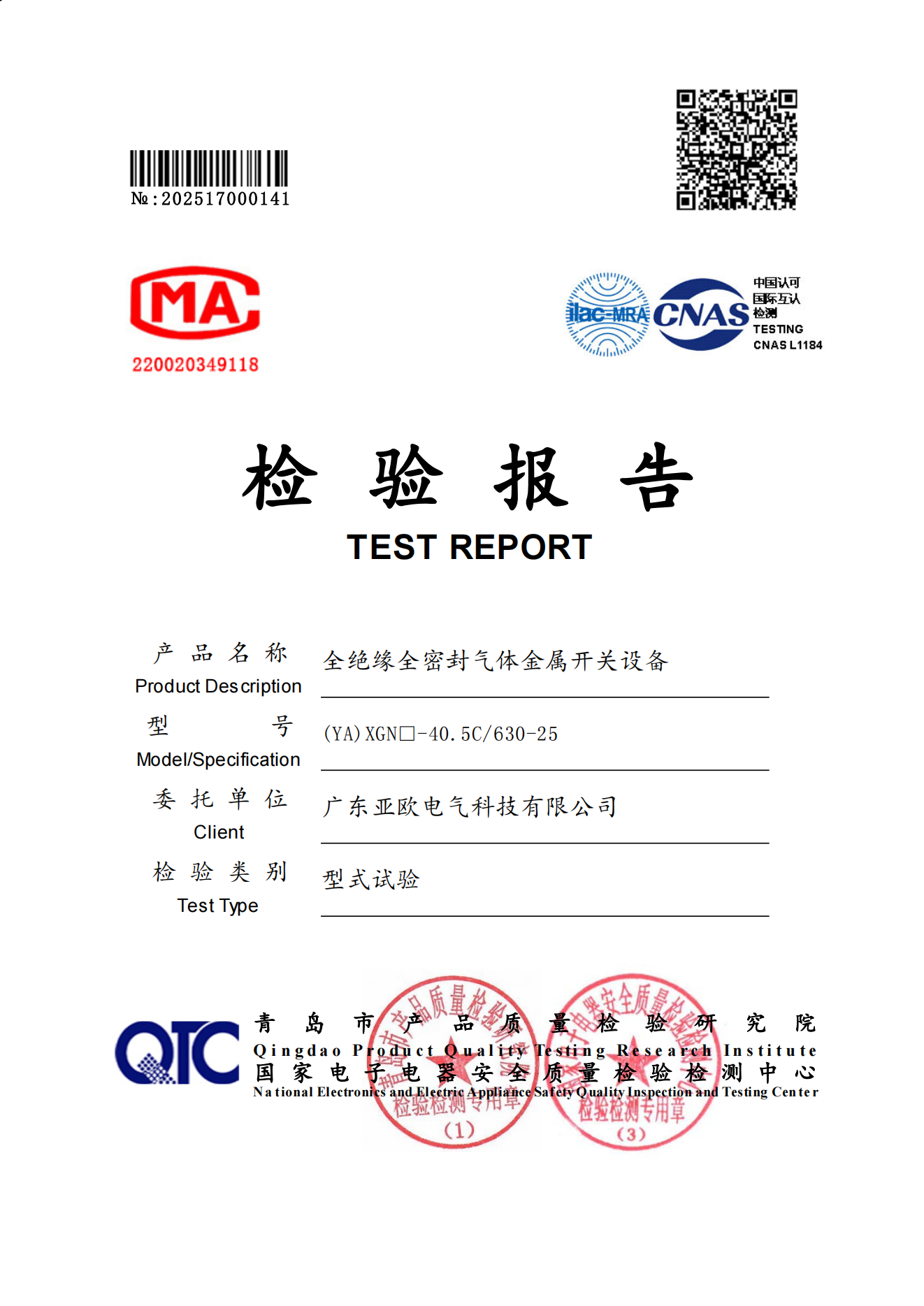 本產品型號規格及相關情況說明:試品型號:(YA)XGN□-40.5C/630-25,額定電壓:40.5kV;額定電流:630A;額定頻率:50Hz;外殼防護等級:外殼:IP4X;隔室:IP2X。主回路額定短時耐受電流:25kA,4s;額定峰值耐受電流:63kA,0.3s;接地開關額定短時耐受電流:25kA,4s;額定峰值耐受電流:63kA,0.3s;接地回路額定短時耐受電流:21.65kA,2s;額定峰值耐受電流:54.6kA,0.3s。