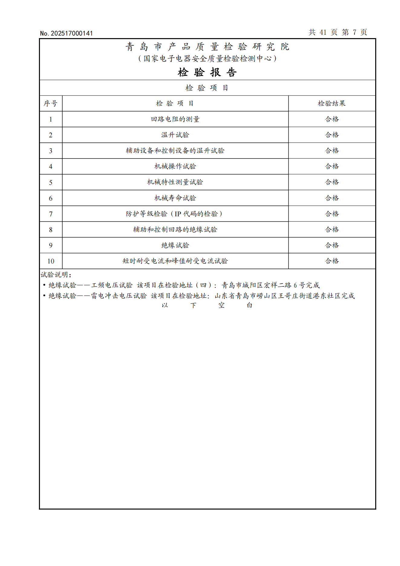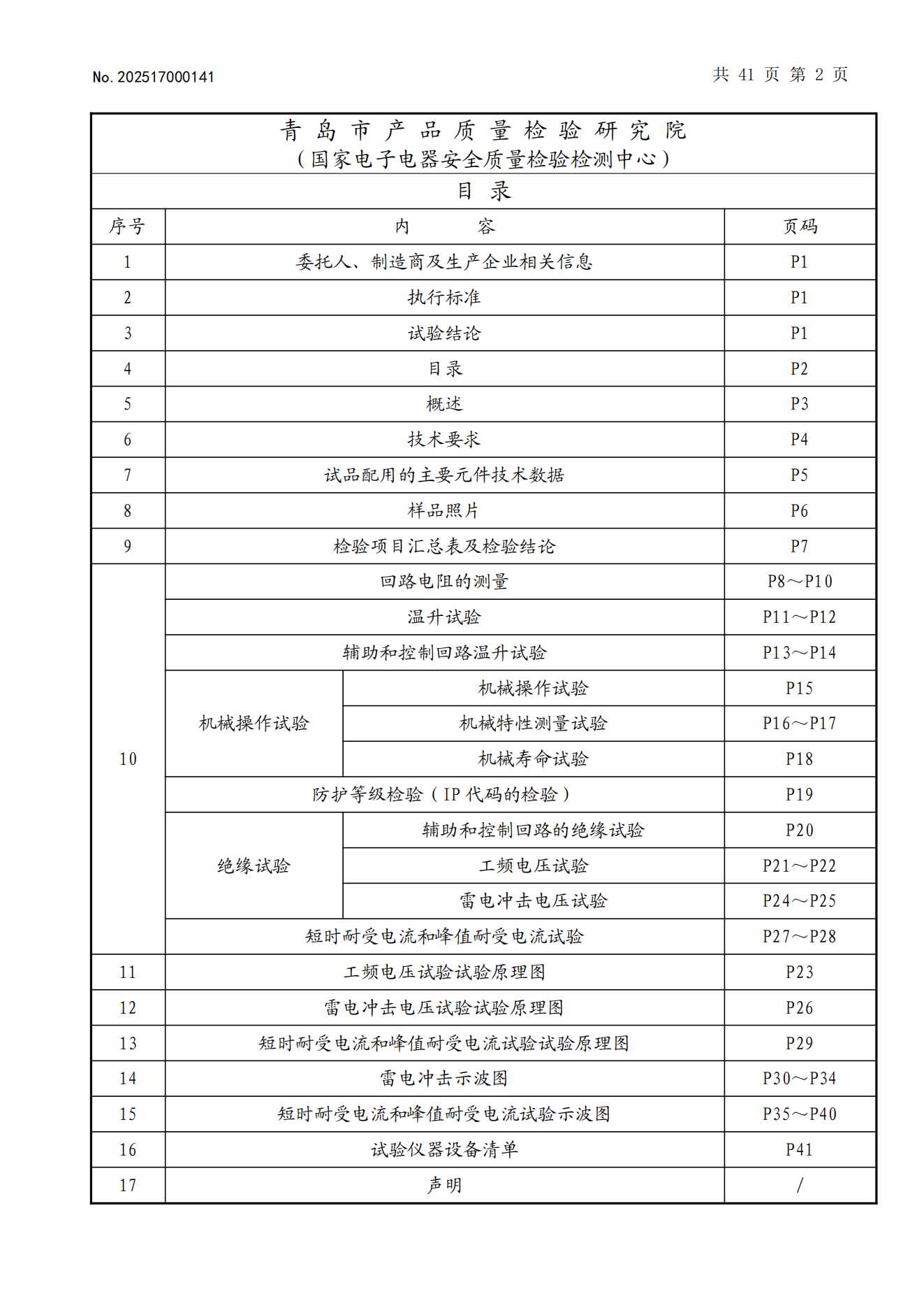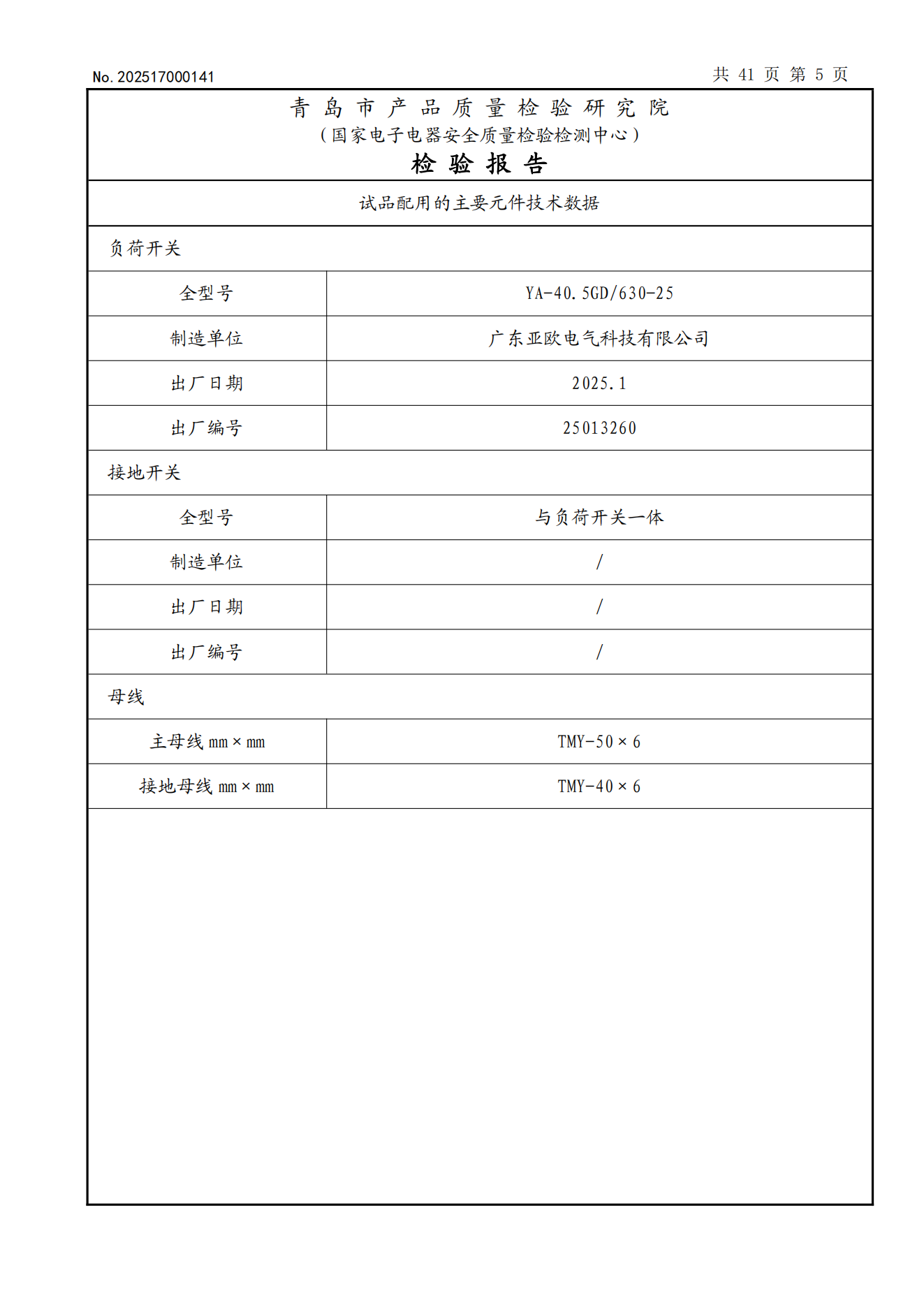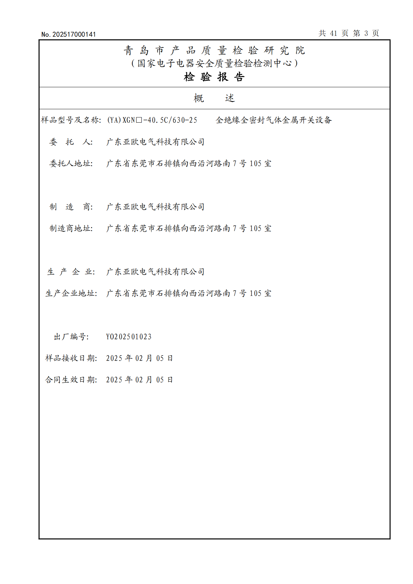 本產品型號規格及相關情況說明:試品型號:(YA)XGN□-40.5C/630-25,額定電壓:40.5kV;額定電流:630A;額定頻率:50Hz;外殼防護等級:外殼:IP4X;隔室:IP2X。主回路額定短時耐受電流:25kA,4s;額定峰值耐受電流:63kA,0.3s;接地開關額定短時耐受電流:25kA,4s;額定峰值耐受電流:63kA,0.3s;接地回路額定短時耐受電流:21.65kA,2s;額定峰值耐受電流:54.6kA,0.3s。